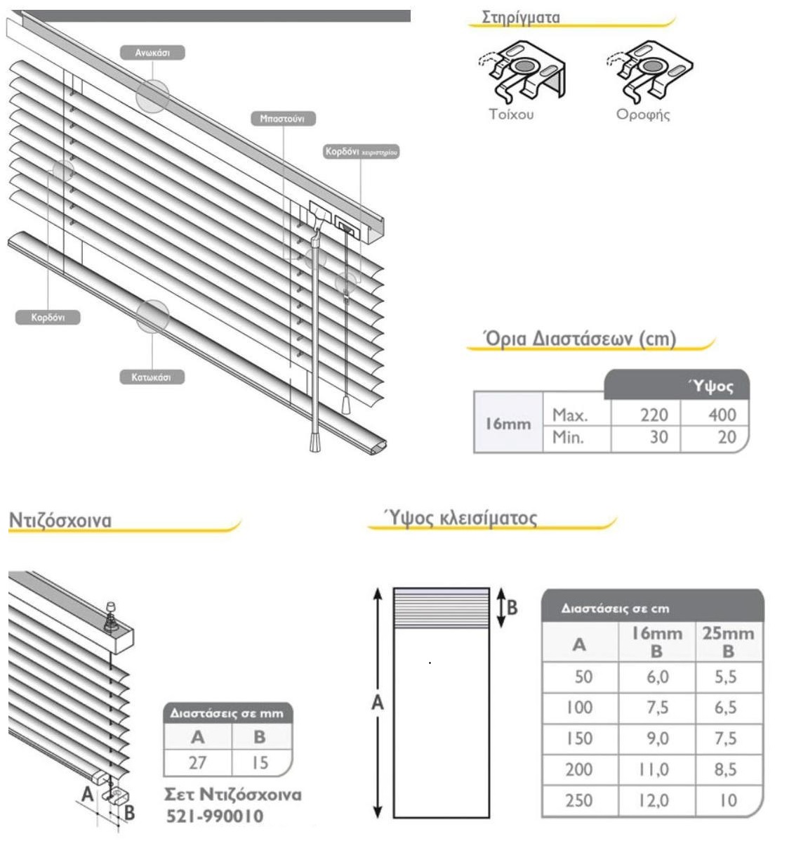 - Στήριξη με πλαινούς οδηγούς (ντίζες), για τοποθέτηση πάνω σε παράθυρα ή μπαλκονόπορτες
