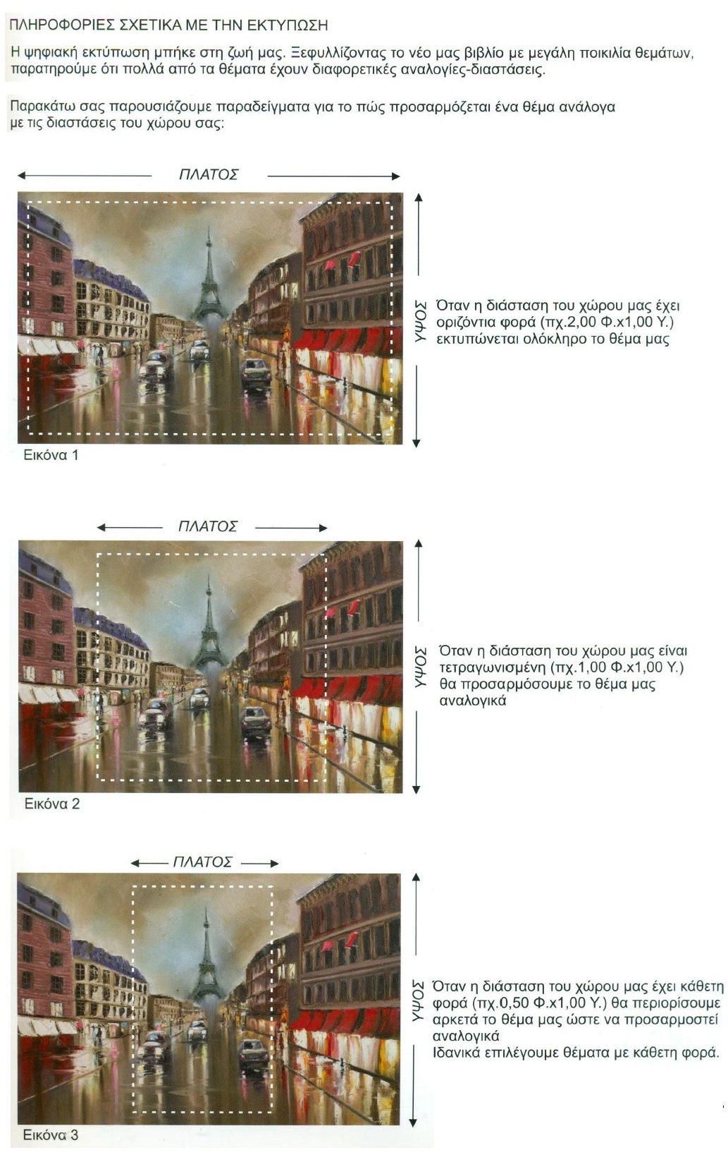 - Οι ζητούμενες διαστάσεις θα πρέπει να ταιριάζουν (έστω στο περίπου) στο σχήμα του επιλεχθέν σχεδίου, προκειμένω να μην παραμορφώθεί η εικόνα.Αυτό ισχύει για όλα τα θέματα που αφορούν μία ολοκληρωμένη εικόνα. Δεν ισχύει για οποιοδήποτε θέμα που απεικονίζει ένα επαναλαμβανόμενο μοτίβο ή κάποιο θέμα με λευκό φόντο