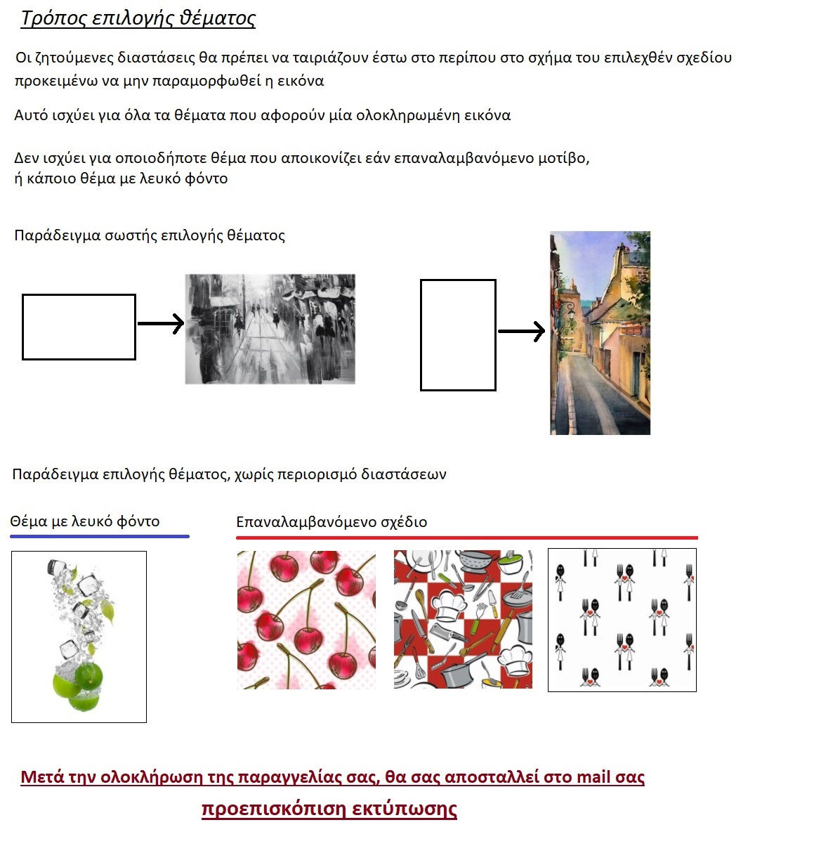 - Οι ζητούμενες διαστάσεις θα πρέπει να ταιριάζουν (έστω στο περίπου) στο σχήμα του επιλεχθέν σχεδίου, προκειμένω να μην παραμορφώθεί η εικόνα.Αυτό ισχύει για όλα τα θέματα που αφορούν μία ολοκληρωμένη εικόνα. Δεν ισχύει για οποιοδήποτε θέμα που απεικονίζει ένα επαναλαμβανόμενο μοτίβο ή κάποιο θέμα με λευκό φόντο
